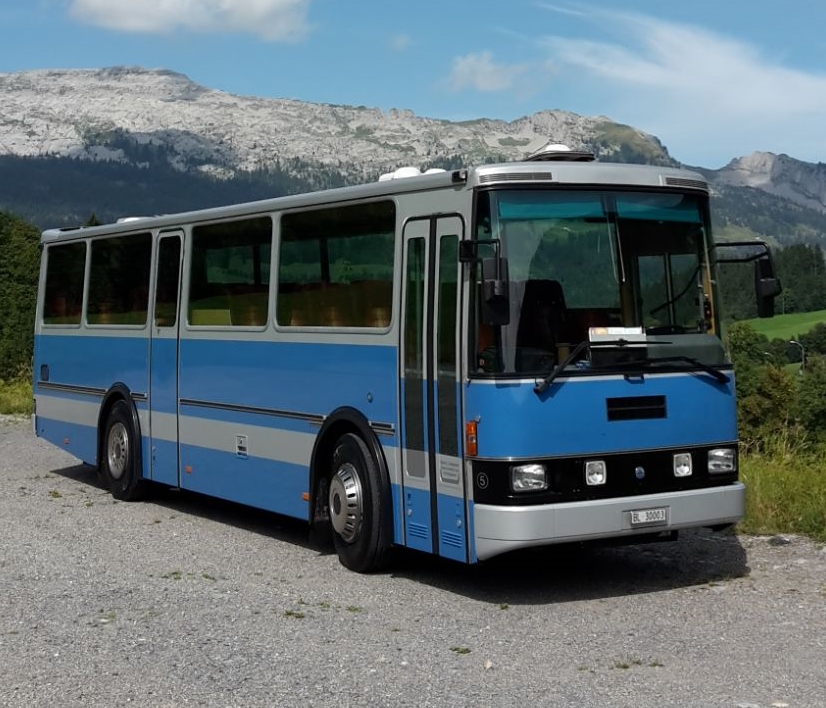 Dieses Fahrzeug in blau und silber lackiert ist ein Reisewagen, der höchsten Ansprüchen genügt. Bei dieser Gelegenheit weisen wir gerne auf die nachträgliche eingebaute Klimaanlage hin, die für ein ausgezeichnetes «Klima an Bord» sorgt. Dieser ehemalige Ausflugswagen vom Autobetrieb Weesen-Amden im Kanton St.Gallen ist für uns mit seinem Baujahr 1985 noch kein Oldtimer, auch wenn er schon über 30-jährig ist! Der Komfort lässt sich – ausgenommen einer Bordtoilette – mit den heutigen Fahrzeugen gut vergleichen. Unser Saurer stellt einen ganz besonderen Meilenstein der Schweizer Nutzfahrzeug-Geschichte dar; er ist der allerletzte Bus der erfolgreichen «Saurer RH- Serie», die an die Schweizer Reisepost und an andere Verkehrsbetriebe in der Schweiz geliefert wurde. Nach diesem Modell lief die Busproduktion unter dem Namen Saurer aus.